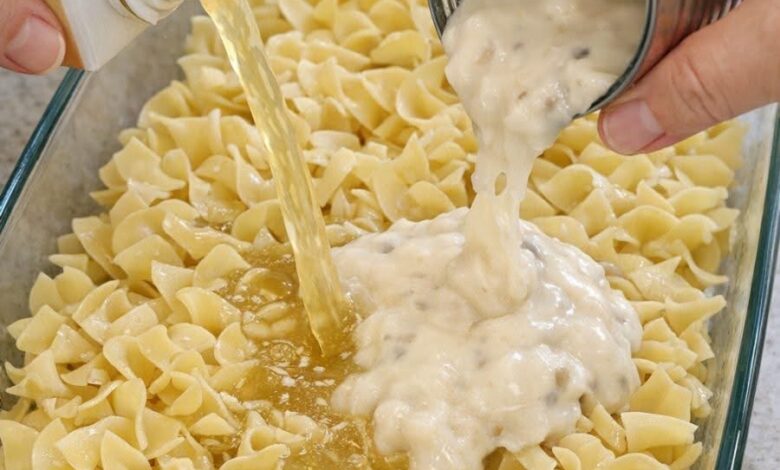 - Add uncooked egg noodles directly into the baking dish.