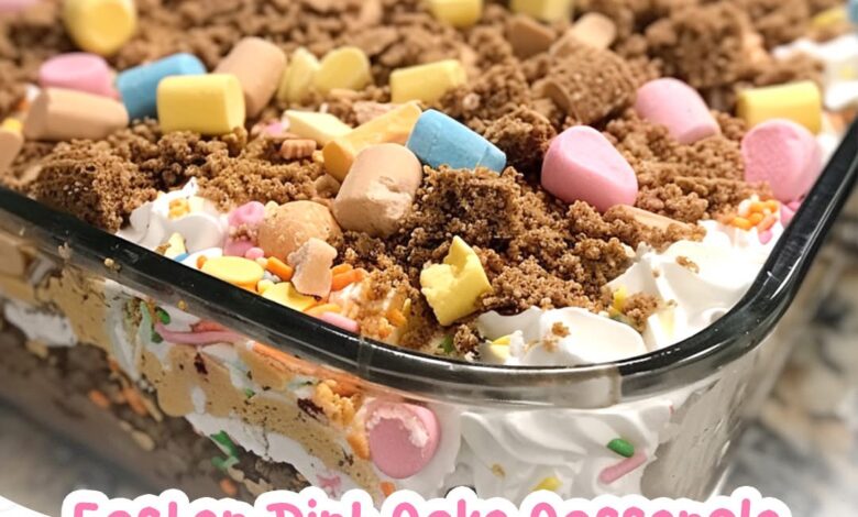 Easter Dirt Cake Casserole is a fun and festive no-bake dessert that’s perfect for spring celebrations. This creamy layered treat combines crushed chocolate cookies, smooth cream cheese filling, rich chocolate pudding, and fluffy whipped topping. The top is decorated with colorful candy eggs and optional gummy worms to create a playful “Easter garden” look.