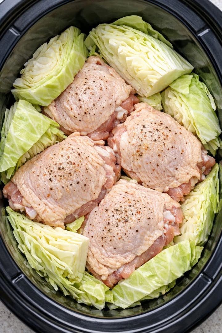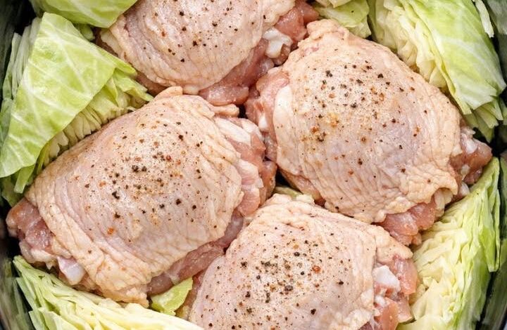 Lay the chicken thighs on top of the cabbage. -