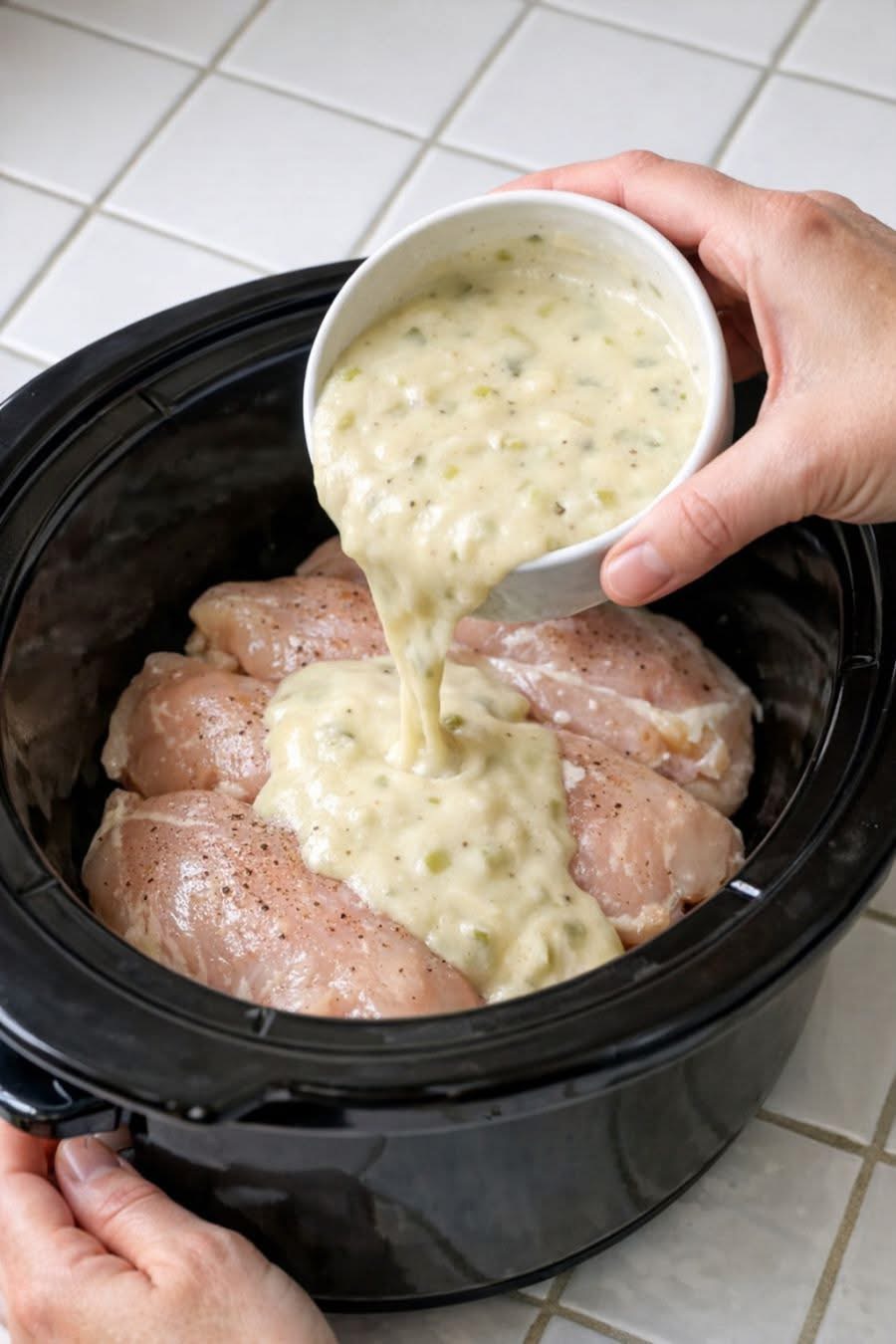 Place chicken breasts into the slow cooker.