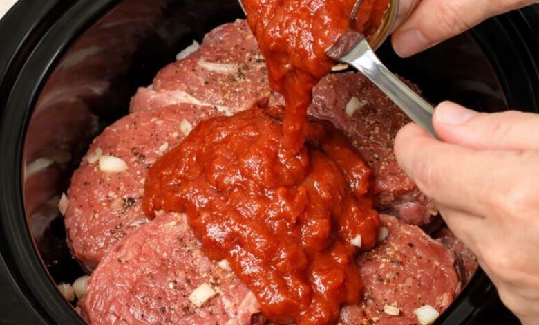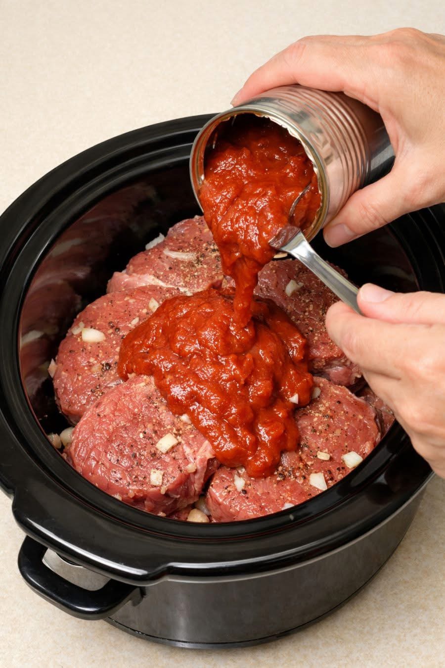 A simple, hearty slow cooker meal that turns budget-friendly round steak into a tender, flavorful dinner simmered in rich tomato sauce.